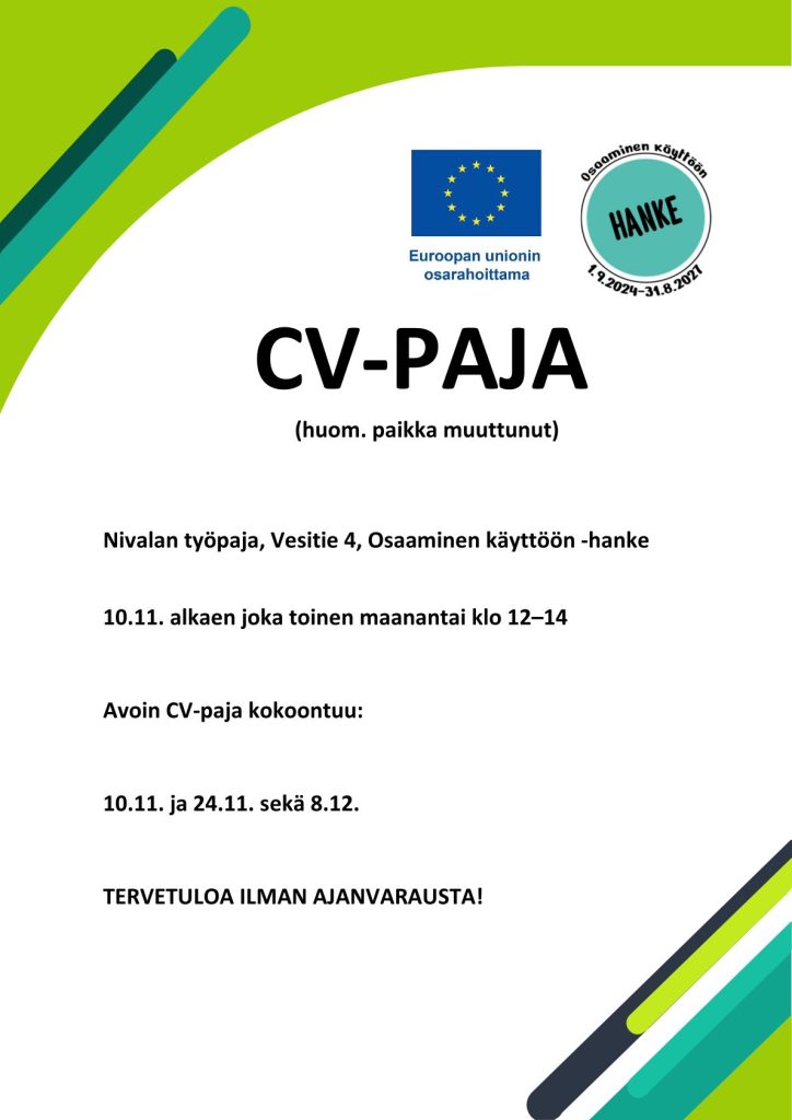 Osaaminen käyttöön hankkeen CV-PAJA palvelee ilman ajanvarausta maanantaisin10.11., 24.11. ja 8.12. klo 12 – 14 Nivalan työpajan tiloissa osoitteessa Vesitie 4.