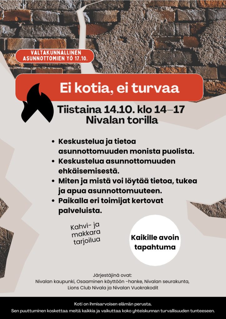 Ei kotia, ei turvaa – valtakunnallinen asunnottomien yö tapahtuma 14.10.2025 klo 14 – 17 Nivalan torilla.
